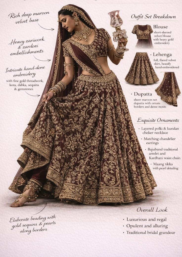 The crimson isn't flat—it's ombre-dyed from ruby red to blush pink at the hems, evoking the blush of a bride's first stolen glance. This look screams mehendi mayhem: practical for all-night dancing, yet polished enough for Instagram lives. Vasireddy's ethos, "ethnic with an edge," shines in reinforced seams for durability, and modular elements like detachable sleeves for day-to-night versatility.
